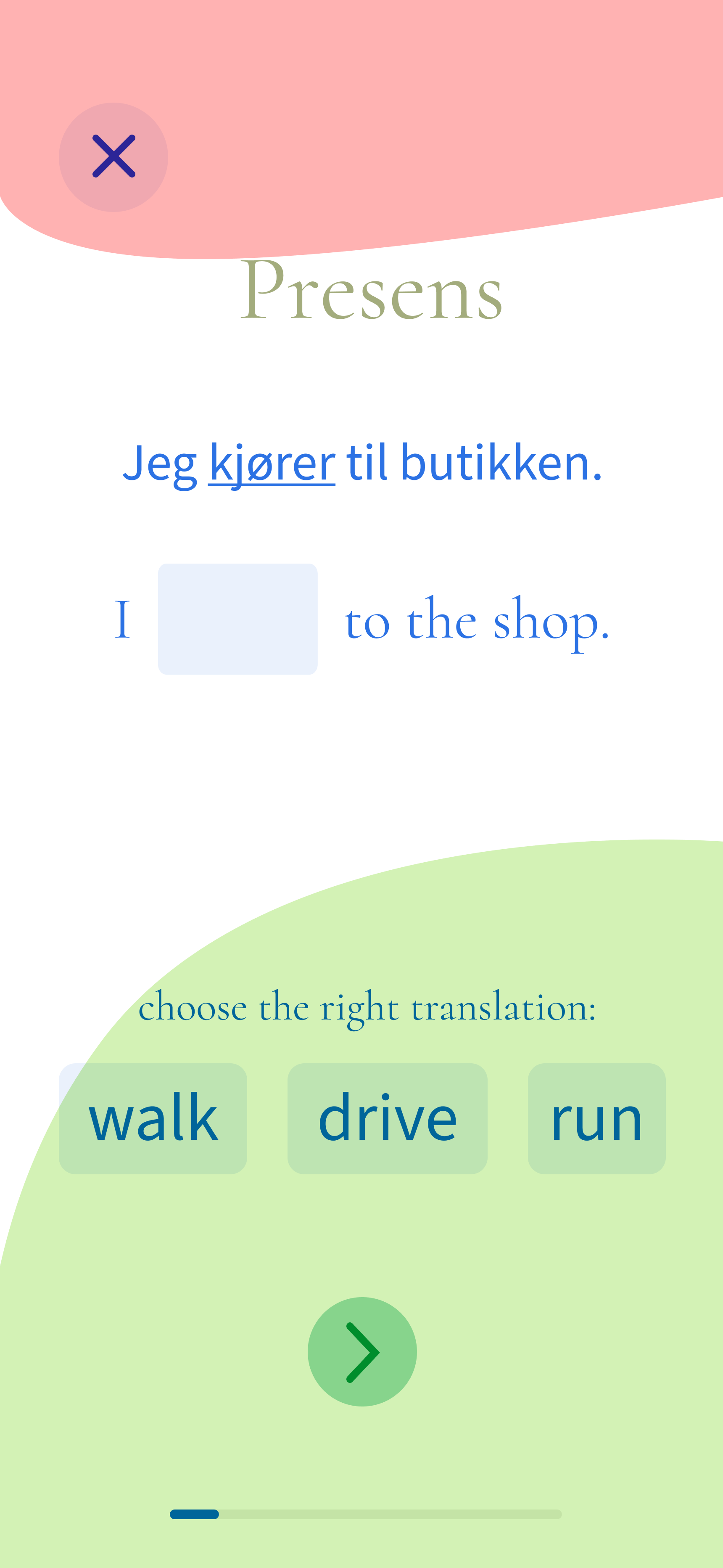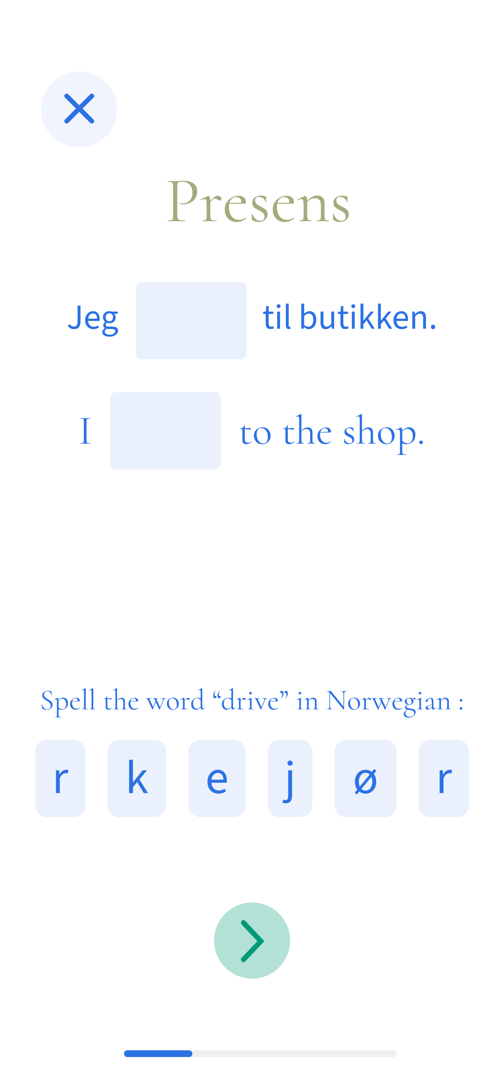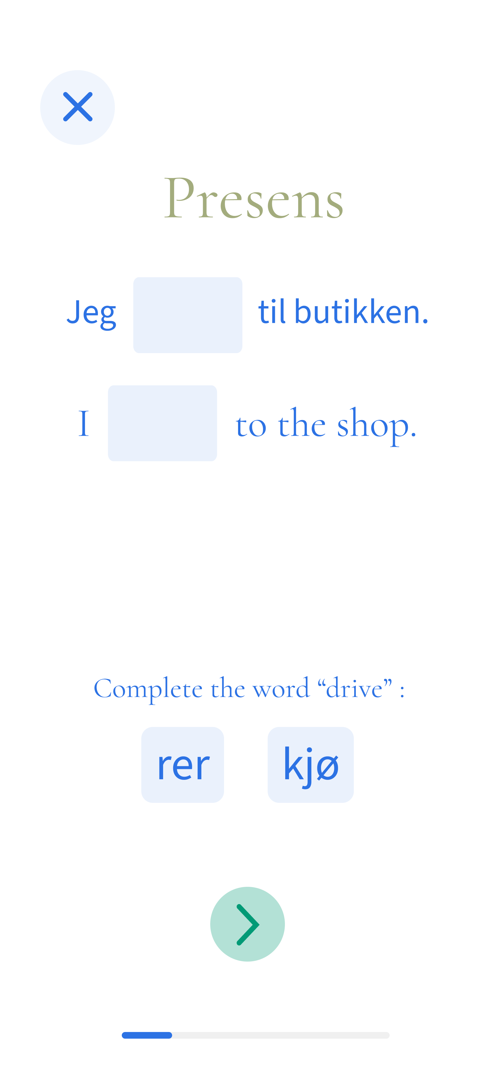 Here, I create exercises that gradually help the learner remember the word 'kjører.'
